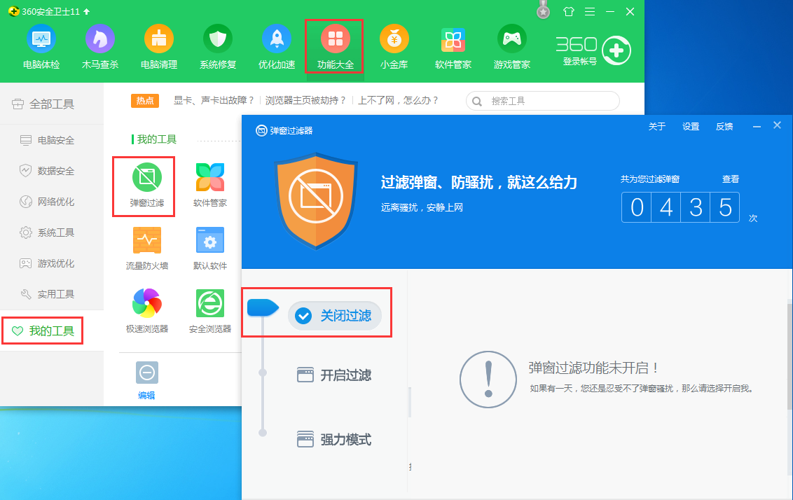 ????打開360安全衛士,在“功能大全”—》“我的工具”內找到“彈窗過濾”工具打開彈窗過濾器,點擊“關閉過濾”即可。