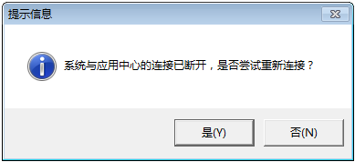 ????第一種解決方式:鼠標雙擊軟件界面最下方的“連接狀態:已斷開”字樣,系統會彈出“系統與應用中心的連接已斷開,是否嘗試重新連接?”提示信息,如下圖所示,點“是”按鈕,客戶端程序會嘗試重新建立與應用中心程序的連接。如果連接成功即可打開相應的功能,繼續使用軟件。