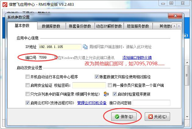 ????修改通訊端口的方法也很簡單,在“信管飛軟件應用中心”程序中,點“系統參數設置”中基礎參數中修改端口號為其他未使用的端口即可,比如7098、7097、7096...,修改保存參數后,需重啟“亞拓軟件應用中心”程序,以便使配置生效。同時,客戶端程序登錄的時候,也要使用新的端口(方法:在登錄窗口,點“選擇賬套”按鈕,輸入新的通訊端口號)。