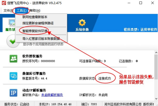 ????智能修復軟件環境完成后,請重啟應用中心程序,然后查看下數據庫連接狀態是否顯示為連接成功(如下圖所示),數據庫狀態為連接成功,則軟件即可正常登錄。