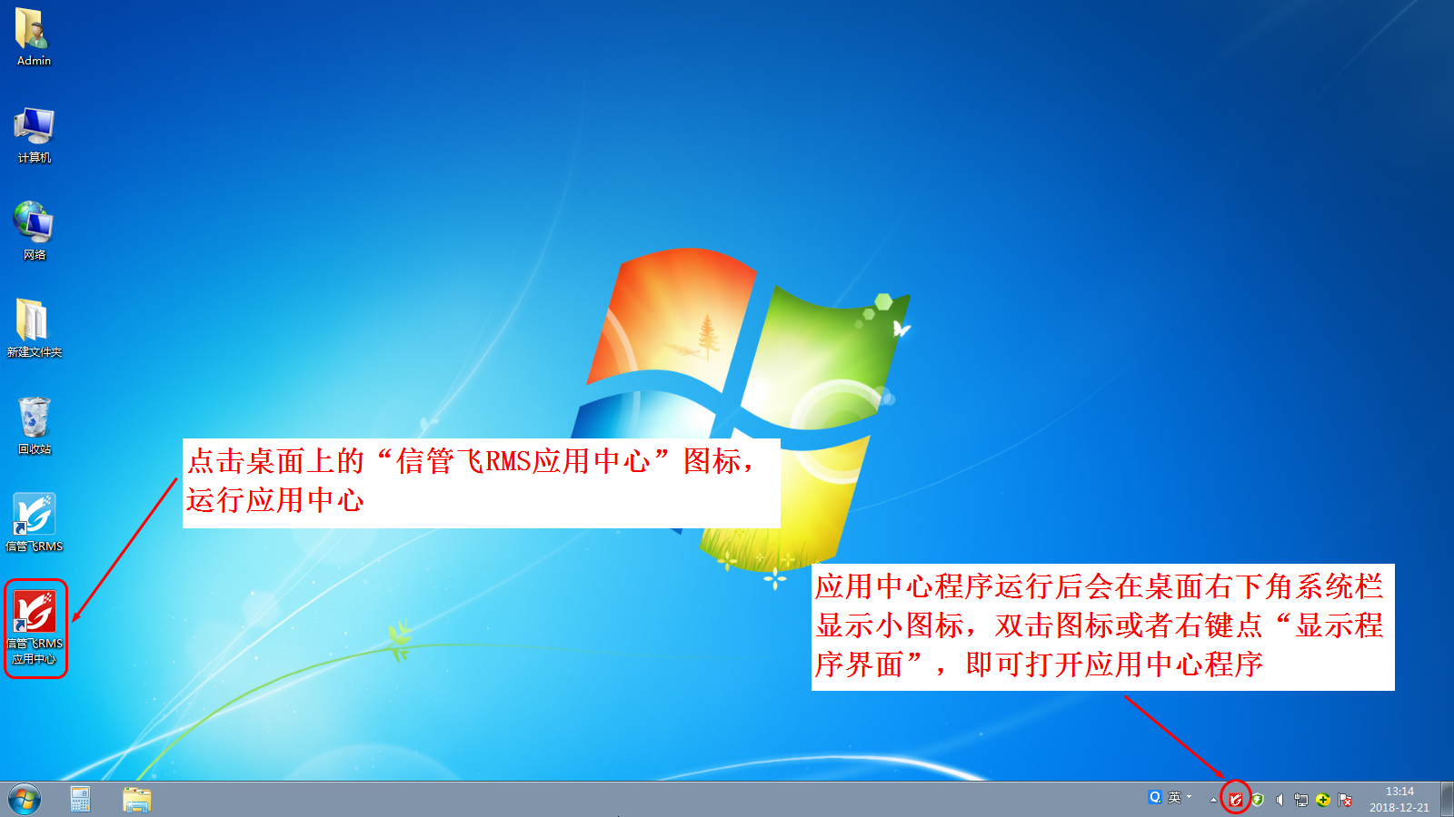 ????主機電腦開機且運行“信管飛RMS應用中心”程序;點擊桌面上的“信管飛RMS”程序圖標(或者在開始菜單中點擊程序組中的相應功能),即可打開運行應用中心程序。應用中心程序運行后會在桌面右下角顯示應用中心圖標: