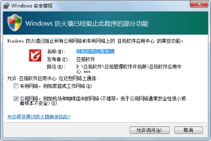 ????首次運行應用中心程序,如果防火墻彈出提示窗口,則Win7系統請點擊“允許訪問”按鈕允許訪問(專有網絡不需要打勾選擇);WinXP系統請點擊“解除阻止”按鈕即可。