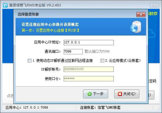 ????點擊桌面上的“信管飛RMS”程序(以下簡稱“客戶端程序”)圖標(或者在開始菜單中點擊程序組中的相應功能),即可打開客戶端程序。點“選擇賬套”按鈕,可以輸入“應用中心”所在電腦(即主機電腦)的IP地址以及通訊端口,如果是通過互聯網遠程連接請輸入購買動態IP解析服務后我們提供的IP解析帳號和使用口令,然后點“下一步”按鈕,選擇要登錄的賬套。