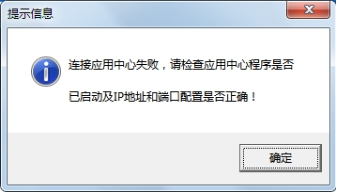 ????部分用戶有時在登陸軟件時會提示“連接應用中心失敗,請檢查應用中心程序是否已啟動及IP地址和端口配置是否正確!”,如下圖所示。