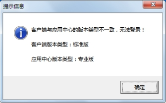 ????③如果登錄的時候提示如下信息,則表明客戶端程序的版本類型與主機電腦上的應用中心程序的版本類型不一致,請使用相同版本類型的程序登錄即可。