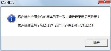 ????④客戶端程序登錄的時候,如果發現與主機電腦上的應用中心程序版本號不一致,會提示如下信息,用相同版本的安裝程序安裝一下即可。