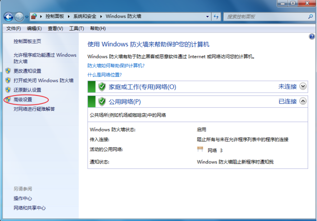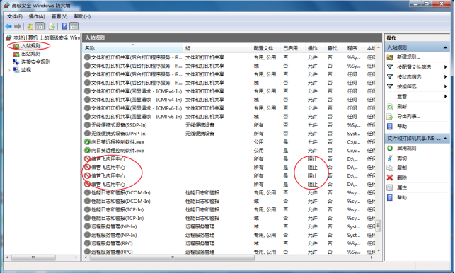 ????打開“控制面板”→“系統和安全”→“Windows防火墻”→“高級設置”→“入站規則”,把被阻止的應用服務程序刪除掉,然后重新添加端口到防火墻即可。