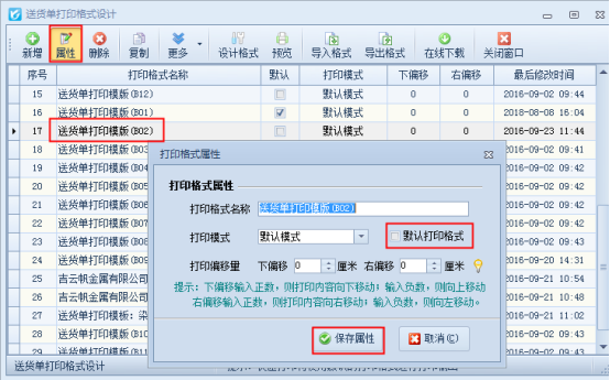 ????一、在打印格式設計界面工具欄的“屬性”中進行操作。如示例需要設置“送貨單打印模板(B02)”為默認模板,選擇B02模板,點擊工具欄中的“屬性”,彈出的打印格式屬性界面,在“默認打印格式”處打勾,然后保存屬性。如下圖所示: