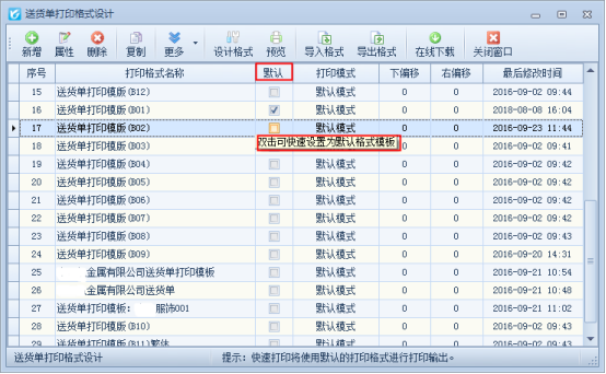 ????二、在默認框中雙擊快速設置為默認模板,在打印模板后邊的默認選擇框中,雙擊此處可以快速把模板設置為默認模板,如下圖所示: