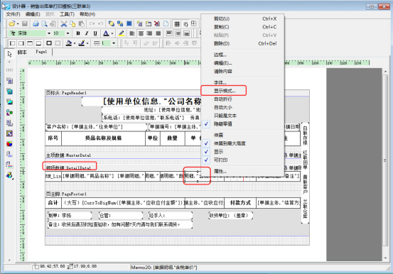 ????設置打印模板和單據界面一致,在開好的單據界面選擇“打印”—》“打印格式設計”—》“設計格式”,進入打印設計器界面,選擇細項數據的單價文本框,右鍵選擇“顯示格式”,如下圖所示: