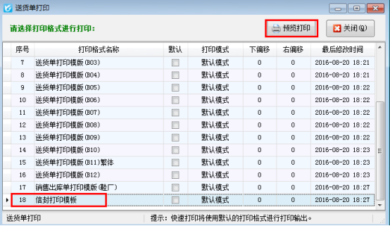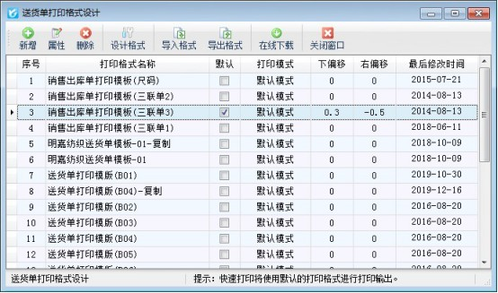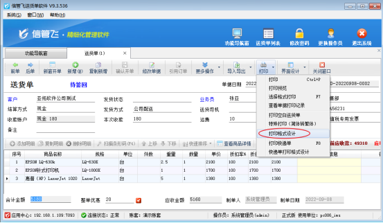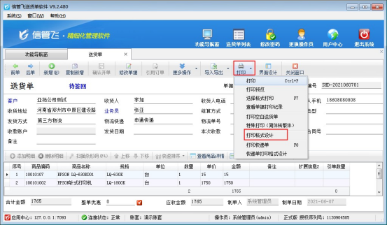????信管飛送貨單軟件、信管飛RMS軟件、信管飛倉庫管理軟件等,在開單界面都內置了好幾種打印格式,除此之外,軟件也支持自定義設計打印模板格式,為了開單打印單據方便,軟件可以把常用的模板設置為默認模板,開單保存后直接進行打印操作。不需要再次選擇模板進行打印。