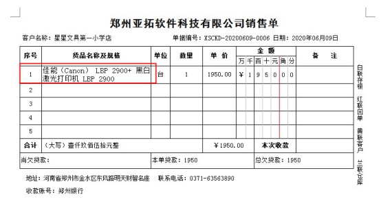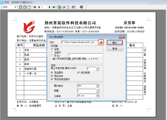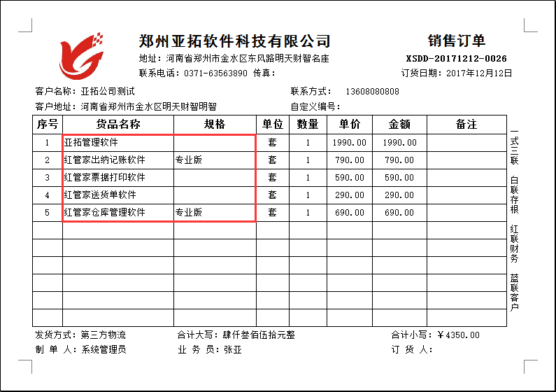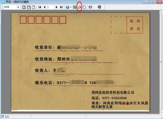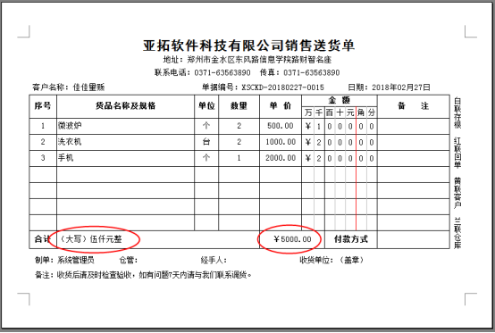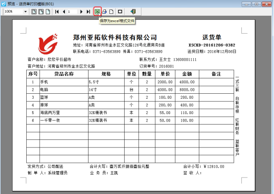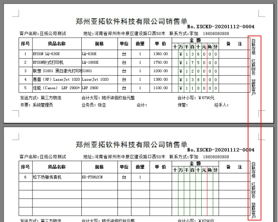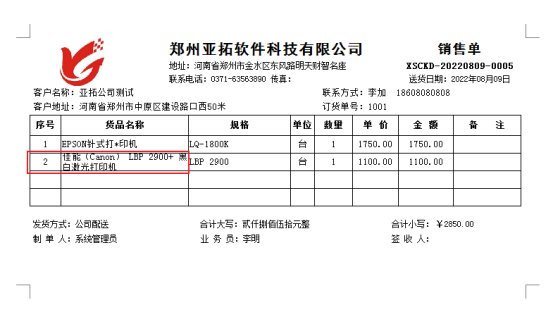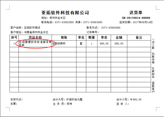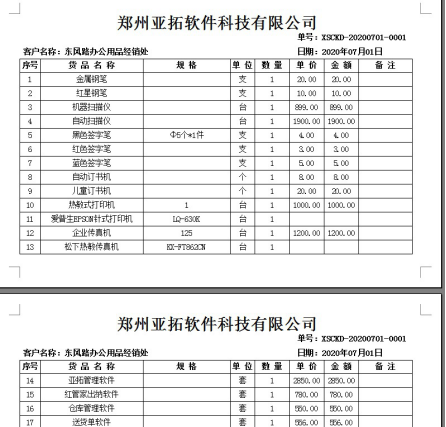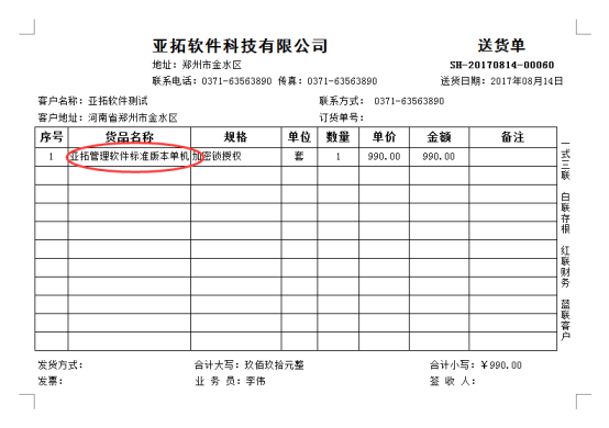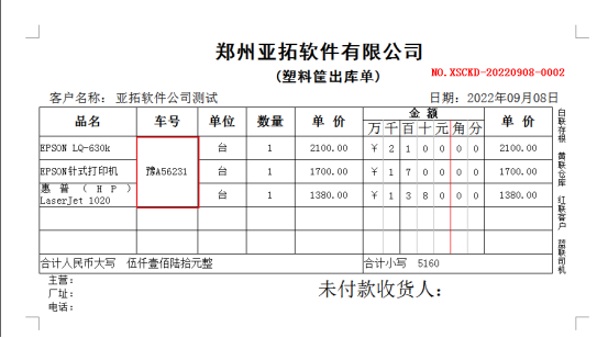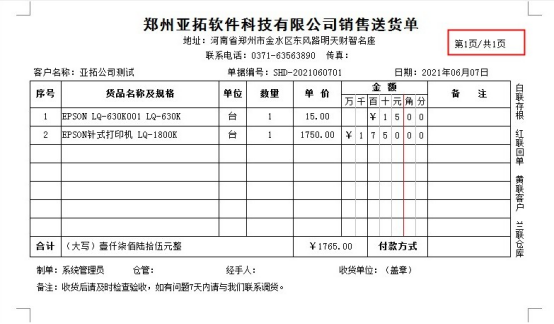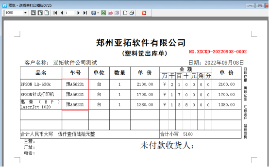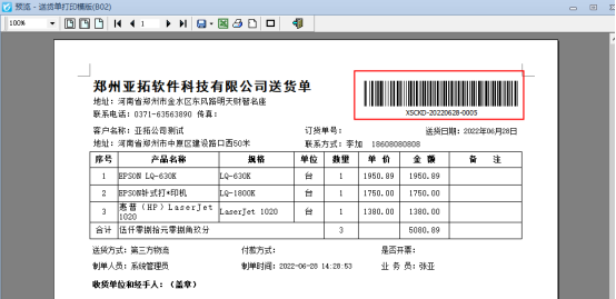 ????軟件默認打印格式的單位是調用的系統管理-使用單位信息,系統管理-系統參數中添加好單位信息后,模板會自動調用顯示,示例單位名稱為:鄭州亞拓軟件科技有限公司,模板預覽圖如下圖所示: