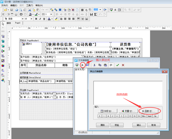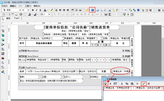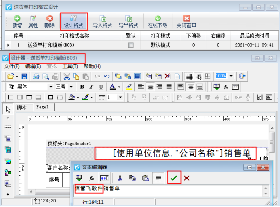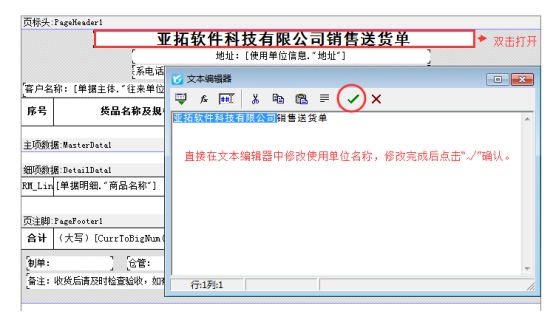 ????打開“設計格式”,在設計器界面,雙擊打開固定的單位名稱文本框,直接在文本編輯器中進行修改單位名稱,修改好后點擊“√”確定,然后保存模板。則固定單位名稱的打印模板修改完成。如下圖所示:
