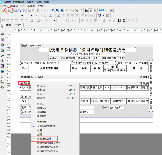 ????設置不顯示空白行,為了避免修改錯誤,可以在打印格式設計界面,選擇模板點擊工具欄中的“復制”按鈕,會自動復制一份打印模板,選擇復制打印模板,點擊“設計格式”進入打印模板設計器界面,在“細項數據”欄上(如沒有細項數據則選擇主項數據),點擊右鍵把“自動增加空行”的勾選符號去掉,然后保存打印模板即可。如下圖所示: