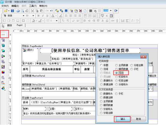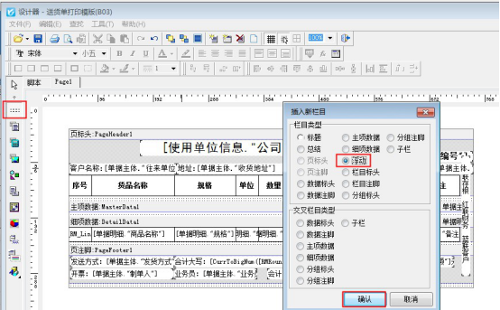 ????如何設置打印多頁時,每一頁都顯示多聯備注內容,下邊進行示范,首先進入模板設計器界面(開單界面打印按鈕下點擊打印格式設計,在打印格式設計界面選擇模板點擊設計格式進入設計器界面),點擊左側工具欄的“插入邊條”,選擇“浮動”位置放到多聯備注處,包圍備注內容,如下圖所示: