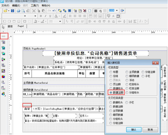????需要合計在最后一頁顯示,需要把“頁注腳”換為“數據注腳”,在模板設計器界面,點擊“頁注腳”進行刪除,然后點擊左側工具欄的第一項,選擇“數據注腳”,添加到合計的位置處,如下圖所示: