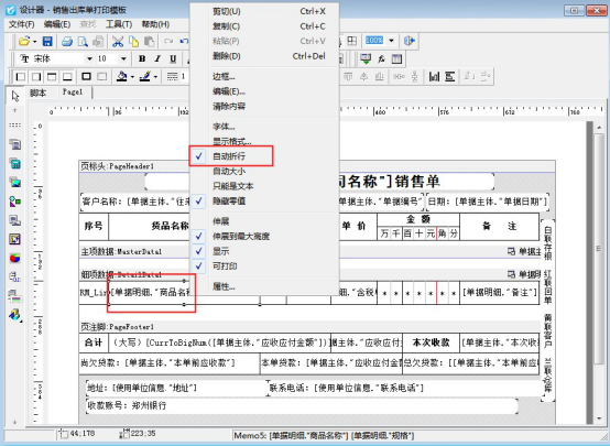 ????在開單界面,打印按鈕下點擊“打印格式設計”,在打印格式設計界面,點擊“設計格式”,可進入模板設計器界面,首先點擊文本框,點擊鼠標右鍵可設置下自動折行,然后把單據明細中的文本框點擊后鼠標右鍵把“伸展”勾選上,如下圖所示: