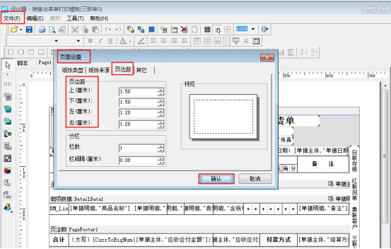 ????在打印格式設計界面,點擊“設計格式”,在模板設計器界面,選擇文件下的“頁面設置”,在頁面設置界面,選擇“頁邊距”,可以調整顯示的邊距大?。ㄜ浖J邊距是1.5cm),如下圖所示: