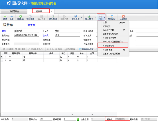 ????以送貨單軟件為例,示范如何在打印模板中直接固定制單人名字,選擇一個送貨單單據,選擇“打印”—》“打印格式設計”—》“設計格式”進入打印模板設計器頁面,如下圖1、圖2所示: