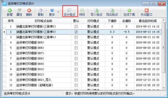 ????本文以信管飛送貨單為例,示范下如何設置常用的打印模板為默認模板。首先先到打印模板設計界面,在開單界面,點擊工具欄中的“打印”按鈕下的“打印格式設計”進入送貨單打印格式設計界面,在此界面進行設置默認模板操作。有以下三種操作形式: