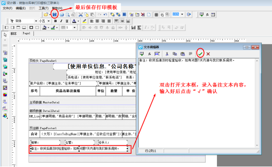 ????在設計器上,選擇模板下方“備注”文本框,雙擊打開,輸入備注文本內容,點擊“√”確定,最后保存打印模板即可。如下圖3所示: