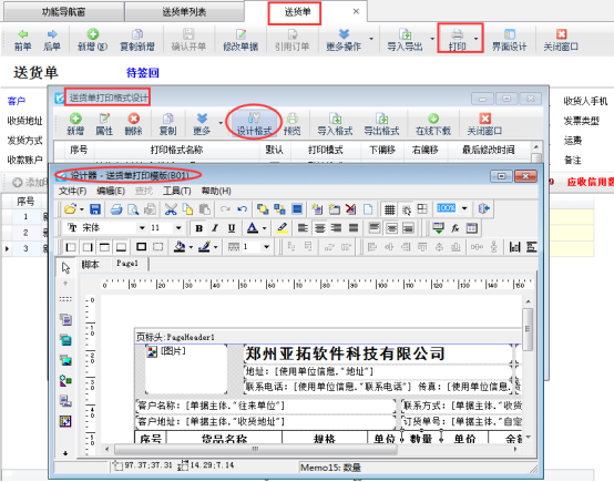 ????新開一個送貨單并保存,選擇客戶“亞拓軟件測試”開單,界面上顯示應收款為1750(本單前應收款),本單應收4330,打印模板上需要顯示客戶欠款,在開單界面打印下選擇“打印格式設計”,進入打印格式設計界面,點擊設計格式,進入模板設計器界面添加,如下圖所示: