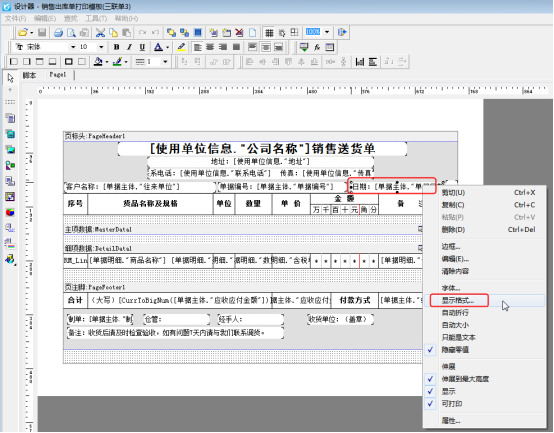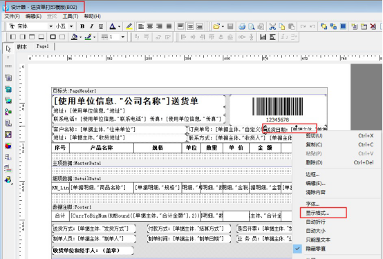 ????在開好的單據界面點擊“打印”—》“打印格式設計”—》“設計格式”,進入打印模板設計器界面,選擇單據日期文本框,鼠標右鍵選擇“顯示格式”,如圖所示。