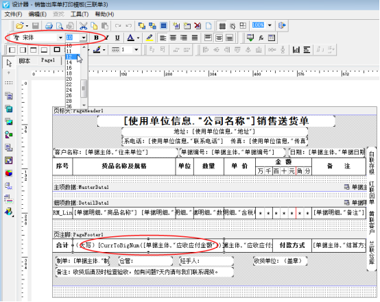 ????在送貨單界面選擇“打印”—》“打印格式設計”進入打印格式設計界面,如當前模板為默認模板則直接在工具欄點擊“設計格式”,不是默認模板,需要先點擊下模板進行選定模板后打開工具欄的“設計格式”,進入打印模板設計器界面。選擇需要修改的文本框,鼠標單機文本框后,對設計器工具欄“字體”、“字號”、“是否加粗”進行選擇。如下圖所示: