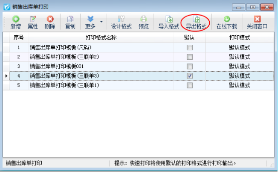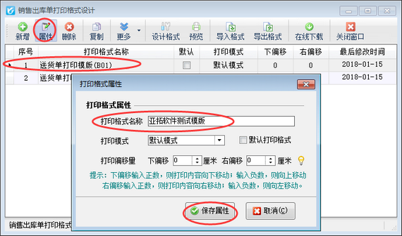 ????設置完成后,為方便和原來的默認模板區分,退回至打印格式設計界面,選擇導入的打印格式點擊屬性按鈕,可修改下打印格式名稱,如下圖所示: