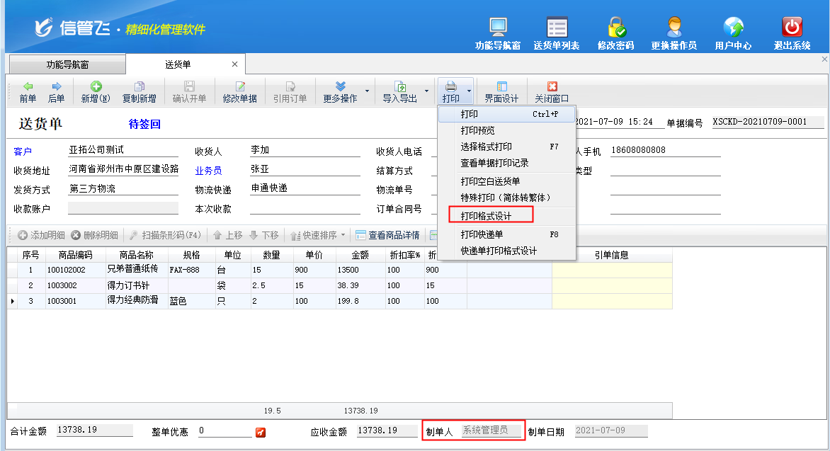 ????歡迎下載試用可自定義設計打印模板的軟件:信管飛送貨單軟件
