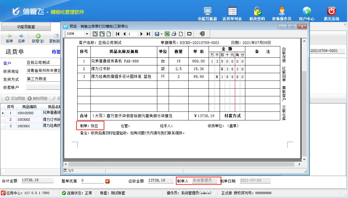 ????信管飛系列軟件都支持打印單據,軟件打印是調用windows打印接口進行打印,不直接調用打印機指令。軟件是將打印預覽內容直接傳送給打印機進行打印,因此如果打印預覽正常,打印出來都是沒有問題的。