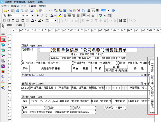 ????信管飛送貨單軟件、信管飛RMS軟件等都支持自定義設計打印模板格式,有客戶存在一張單子打印多頁的情況,為區分順序軟件支持在打印模板上添加上頁數,本文以“信管飛送貨單軟件”為例示范下如何添加打印模板的頁數顯示。