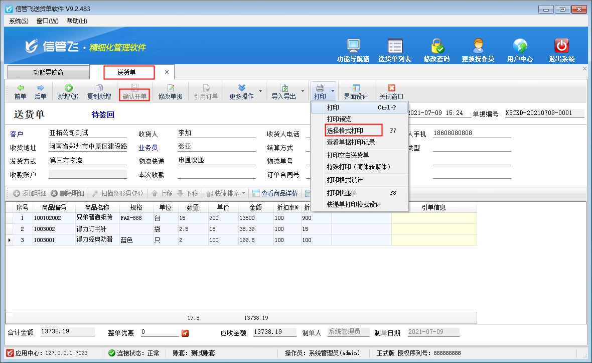 ????歡迎下載試用可調整模板合并打印的開單軟件:信管飛送貨單軟件