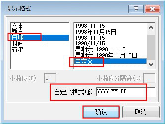 ????打開“顯示格式”窗口,如圖所示,選擇“日期”,選擇需要的日期格式后,點擊“確認”按鈕即可。
