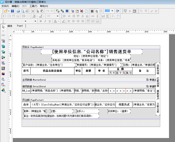 ????在功能導航窗選擇“業務處理”點擊“送貨單列表”,打開一個已保存的送貨單,點擊“打印”按鈕下的打印格式設計,進入打印格式設計界面。在打印格式設計界面點擊“設計格式”可進入模板設計器界面,如下圖所示: