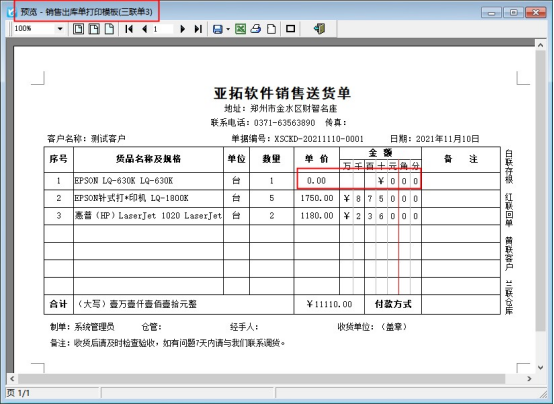 ????新增一個送貨單,保存單據后預覽默認模板顯示單價和金額,如下圖所示: