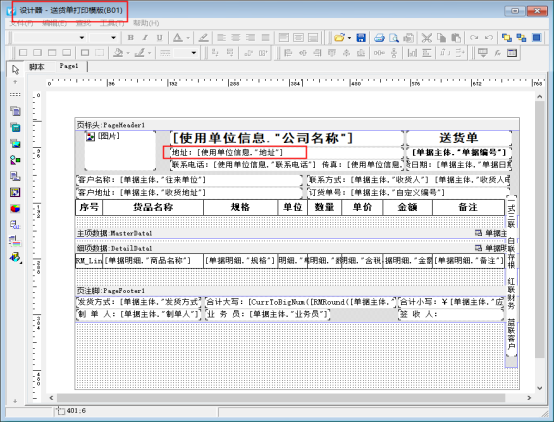 ????打開一個已保存的送貨單,然后在單據界面點擊“打印”—“打印格式設計”按鈕,進入“送貨單打印格式設計”界面,以內置模板(B01)為例,選擇打印格式模版(B01),然后點擊“設計格式”按鈕進入模版設計器界面,如下圖所示。