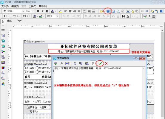 ????修改直接輸入模板中的地址信息,在開單界面點擊“打印”—》“打印格式設計”—》選擇打印模板點擊“設計格式”進入設計格式界面。雙擊打開地址的文本框,修改后點擊“√”確定保存。如下圖所示: