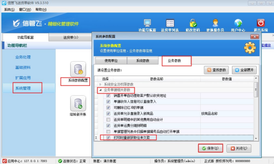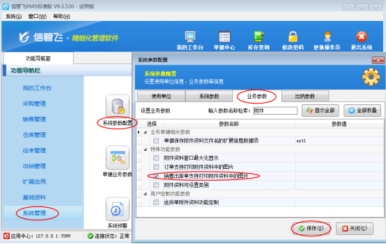 ????在功能導航窗點擊“系統管理”—》“系統參數”,選擇“業務參數”中的“銷售出庫單支持打印附件資料中的圖片”,勾選參數并保存配置,如下圖所示: