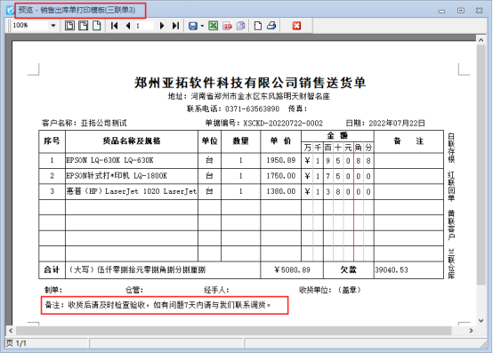 ????備注內容可雙擊打開文本框直接輸入,也可以調用開單界面上的單據主體內容。示例備注直接輸入內容,內容如下“備注:收貨后請及時檢查驗收,如有問題7天內請與我們聯系調貨?!碧砑油瓿珊箢A覽模板如下圖: