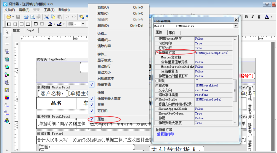 ????在送貨單開單界面,點擊打印按鈕下的“打印格式設計”,選擇此模板,點擊“設計格式”進入模板設計器界面。在模板設計器中,把送貨車號對應的明細數據項文本框右鍵屬性打開,把重復值打印下“合并重復單元格和壓縮重復值”改為“TRUE”,然后保存模板,如下圖所示: