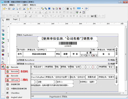 ????單據(jù)確認(rèn)開單后,可打印出單據(jù)編號的條形碼發(fā)給倉庫人員,條形碼可在打印模板中進(jìn)行設(shè)置,開單界面打印按鈕下點(diǎn)擊打印格式設(shè)計(jì),在打印格式設(shè)計(jì)界面點(diǎn)擊“設(shè)計(jì)格式”,進(jìn)入模板設(shè)計(jì)器界面,點(diǎn)擊左側(cè)工具欄的最后一個圖標(biāo),選擇第二個“Barcode”后在模板上添加文本框,然后雙擊打開文本框,彈出的條碼編輯器中代碼取“單據(jù)主體-單據(jù)編號”、條碼類型取“Code128”(二維碼選擇“QRCode”;二維碼直接雙擊選擇數(shù)據(jù)項(xiàng)單據(jù)主體-單據(jù)編號),設(shè)置好后點(diǎn)擊確定,然后預(yù)覽模板可顯示單據(jù)編號的條形碼信息。如下圖所示:
