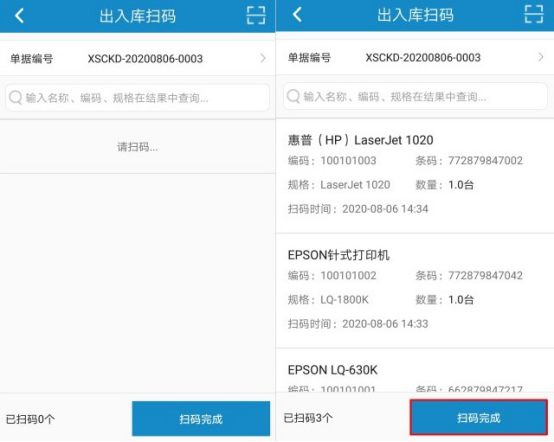 ????出入庫掃碼界面,點(diǎn)擊右上角掃描圖標(biāo),然后掃描單據(jù)編號的條形碼,掃碼后自動進(jìn)入掃描商品信息界面,繼續(xù)點(diǎn)擊掃描圖標(biāo),針對商品的條形碼進(jìn)行掃描,會自動獲取商品信息到出入庫掃碼界面,(默認(rèn)掃描數(shù)量為1,如存在出庫多個相同商品,可掃描多次)掃描完成后點(diǎn)擊“掃碼完成”,如下圖所示: