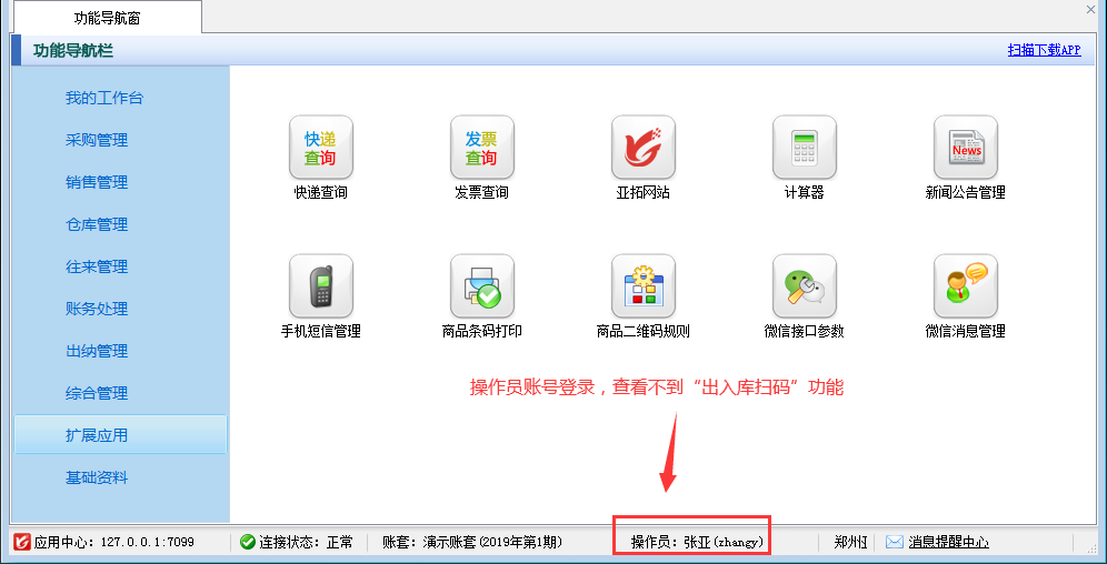 ????操作員權(quán)限設(shè)置完成后,使用操作員“張亞”登錄軟件,打開擴(kuò)展應(yīng)用模塊,可以看到操作員已無法查看到“出入庫掃碼”功能,如下圖所示。