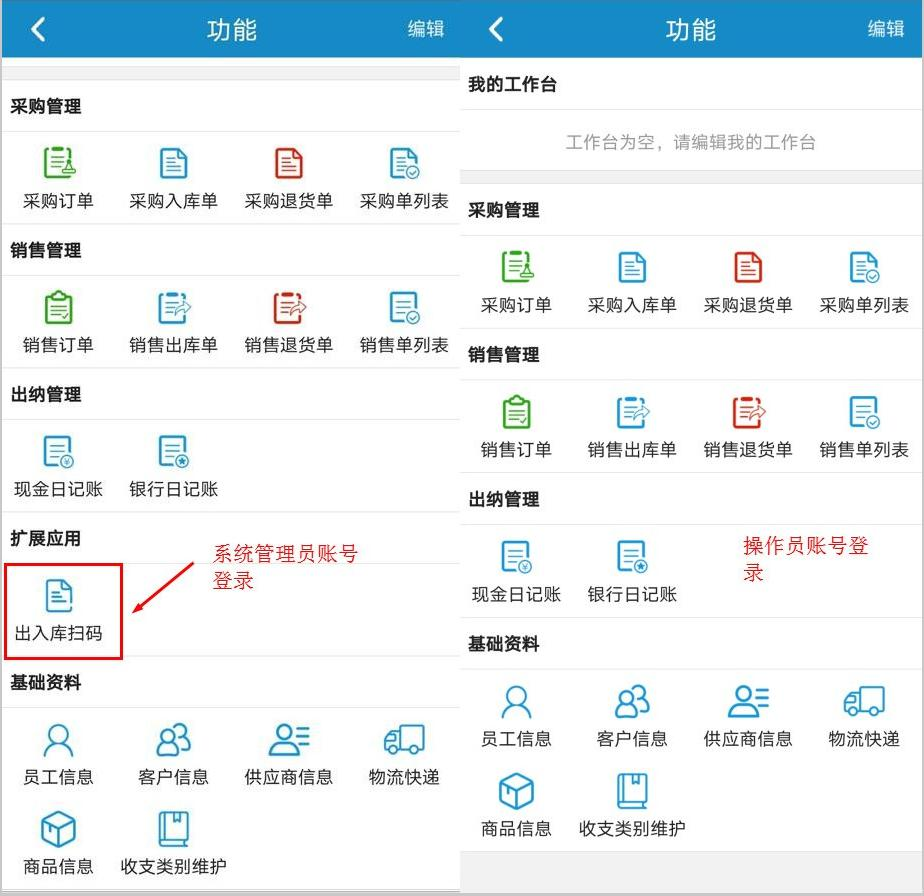 ????操作員賬號登錄手機(jī)APP同樣無法查看“出入庫掃碼”功能,如下圖所示: