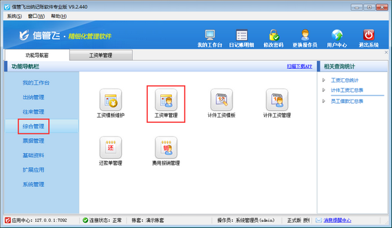 ????信管飛出納記賬軟件專業版、信管飛rms標準版、專業版支持維護工資模板和工資單管理,軟件支持對工資模板維護和工資單界面設置可查看的操作員權限。便于控制操作人員對工資單的維護工作。可指定操作員僅能維護某個工資模板。