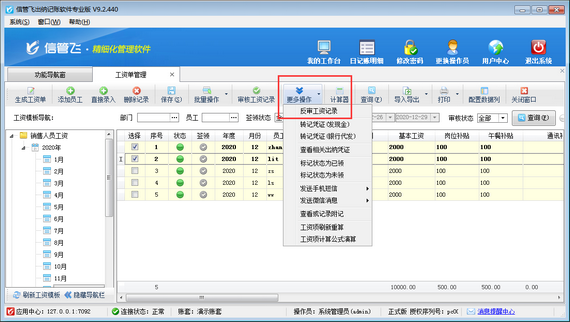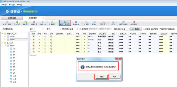 ????信管飛出納記賬軟件專業版包括工資管理功能,支持自定義工資模板,可根據設置的工資模板快速生成工資單,支持從上月工資單復制工資項目數據,工資項目數據錄入完成核對無誤后審核生效,審核后不再支持直接修改。如果工資記錄較多,逐條審核工資記錄會比較耗時,軟件支持批量審核工資記錄,可節省時間提高工作效率。本篇文章介紹一下出納記賬軟件中如何批量審核工資記錄?