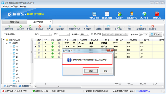 ????在功能導航窗點擊“綜合管理”—》“工資單管理”,打開工資單管理界面,在工資記錄列表中打鉤選擇要反審的工資記錄,然后點擊“更多操作”—》“反審工資記錄”,系統彈出提示信息“您確定要反審當前選擇的工資記錄嗎”,如下圖所示,點擊“確定”按鈕確定反審工資記錄。
