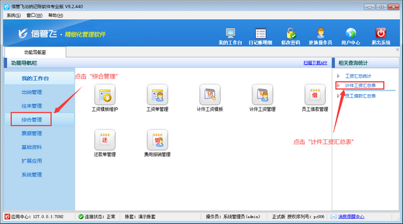 ????在功能導航窗點擊“綜合管理”—》“計件工資匯總表”即可進入員工計件工資匯總表界面,如下圖所示。