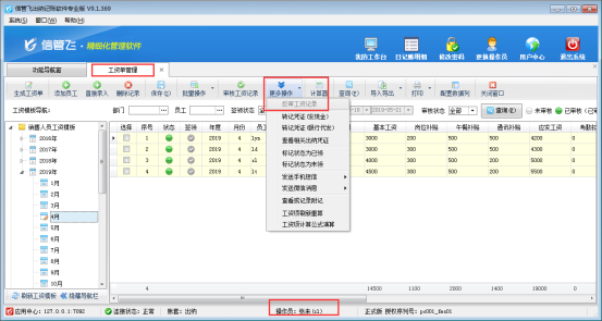 ????操作員權限保存成功后,返回登錄窗口,選擇操作員“張來”登錄軟件,打開“綜合管理”—》“工資單管理”界面,選擇已審核的工資單記錄,在工具欄的“更多操作”下可以看到“反審工資記錄”已變為灰色,無法選擇。如下圖2所示: